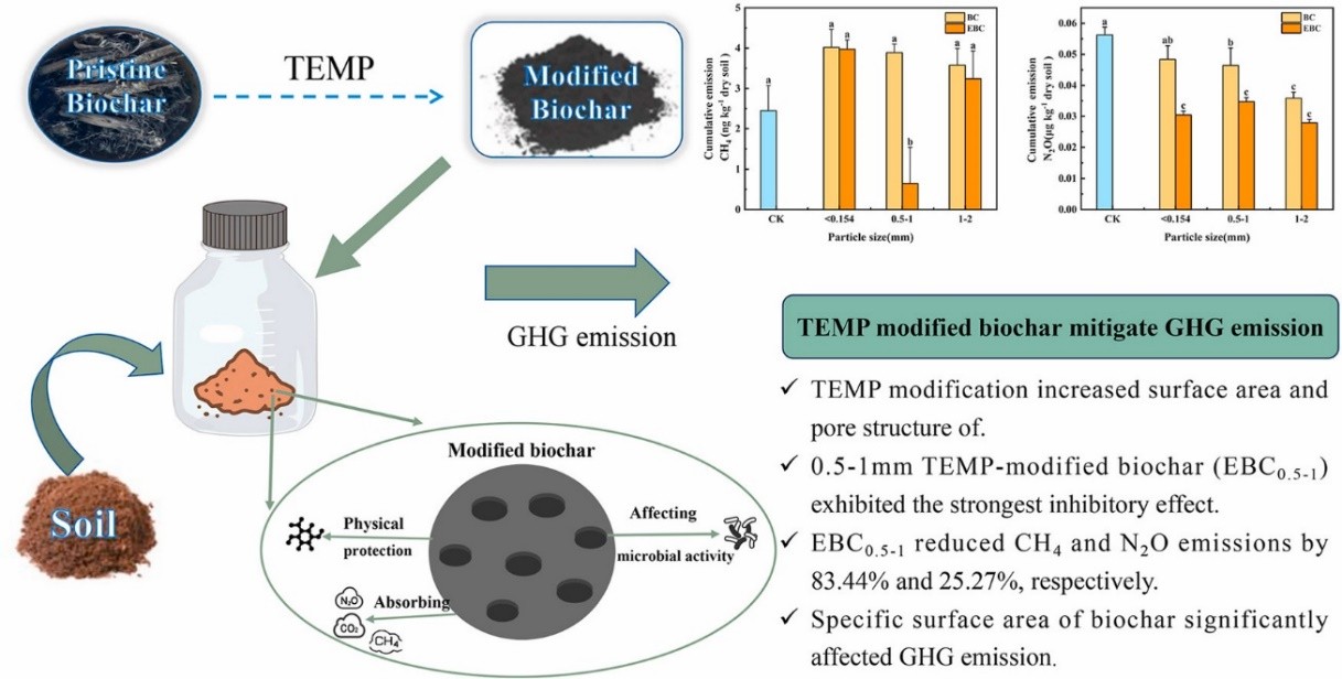 草地是我国陆地生态系统的重要组成部分,但我国却是世界上草地退化严重的国家之一,草地生态脆弱的形势严峻。草地退化造成土壤碳大量流失,还导致草地固碳能力下降。生物炭已成为增强草地土壤碳汇、形成稳定土壤碳库的重要策略。在张春红副教授指导的校级大学生创新创业训练项目“瞬态电磁脉冲(TEMP)改性生物炭对土壤理化性质及温室气体排放的影响”等的支持下,项目组将不同粒径的玉米秸秆生物炭在电压20 kV、频率140 Hz瞬态电磁脉冲场中处理3小时得到TEMP改性生物炭,将TEMP改性生物炭与人工草地土壤(质量比1:100)混合,加入底物适量的碳源和氮源以稳定微生物活性,将混合物在19.8℃进行21天的室内培养。在培养期间,采集样品的温室气体,并同时对土壤理化性质进行测定。结果表明,TEMP改性增加了生物炭的比表面积,改善了其孔隙结构,同时减少了生物炭中C-O-C官能团的比例,其中,粒径为0.5–1 mm的TEMP改性生物炭对土壤温室气体减排作用显著,与未改性生物炭相比,使CO2、CH4和N2O的累积排放量分别减少了7.47%、83.44%和25.27%(图1)。该工作以Transient electromagnetic pulse (TEMP) modified biochar mitigate greenhouse gas emissions from a subtropical grassland soil为题发表在Environmental Research(中科院二区,影响因子:7.7),环境科学与工程2021级代婷和2022级熊涛同学为共同第一作者,参与作者包括2021级陆艳娟等,张春红副教授和陈哲副研究员为共同通讯作者。全文链接:https://doi.org/10.1016/j.envres.2025.123009。