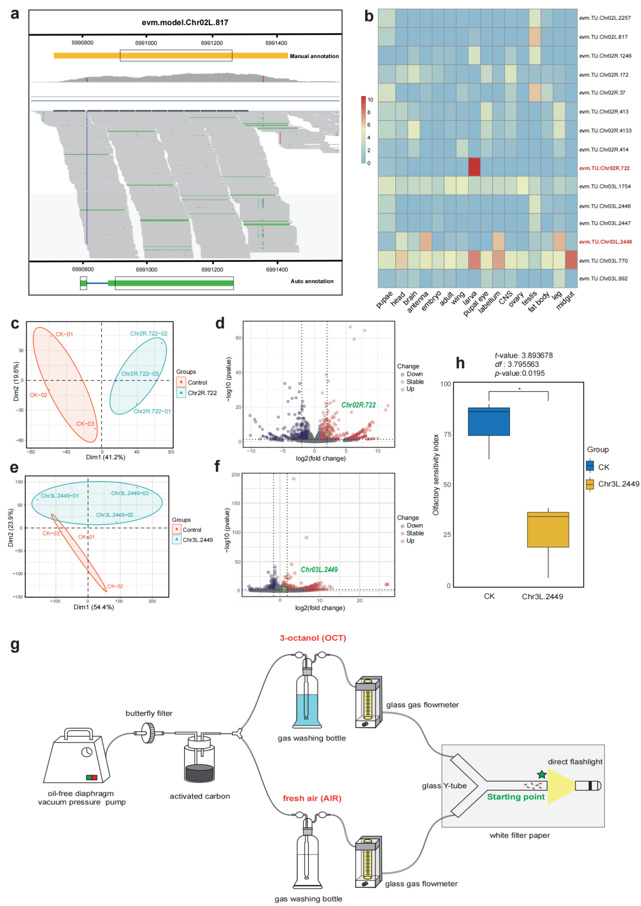 (4)发现并验证新基因功能:基于多证据整合的注释流程,团队在Dm.nT2T中新发现了92个基因。通过CRISPR/Cas9基因敲除技术,研究人员对其中两个组织特异性表达基因进行了功能验证:a) Chr3L.2449:在触角、唇瓣等嗅觉组织高表达。敲除该基因后,突变果蝇在Y型管嗅觉行为实验中,对厌恶气味(3-辛醇)的敏感性显著下降(图4h),首次证实该基因对果蝇嗅觉功能至关重要。该基因在R6参考基因组中位于未组装的缺口区域。b) Chr2R.722:在幼虫期高表达,敲除后虽未引起明显形态学缺陷,但转录组分析提示其可能参与几丁质鞣化、免疫等通路。
