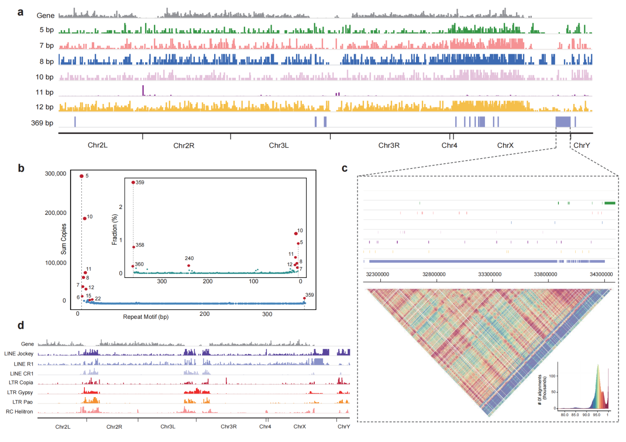 (3)精准定位端粒与着丝粒:(1)果蝇端粒由HeT-A、TART、TAHRE等逆转录转座子维持。Dm.nT2T中鉴定出6个端粒区域,总长度达297 kb,远超R6中的74.3 kb(图3)。其中X染色体左臂端粒最长,为76.24 kb。(2)着丝粒:结合串联重复查找(TRF)和CENP-A组蛋白的ChIP-seq数据,团队精确界定了各染色体的着丝粒区间(图3)。这些区域富含5-12 bp的短卫星重复序列,其中5 bp重复单元拷贝数高达29万次,构成了果蝇着丝粒的核心特征。