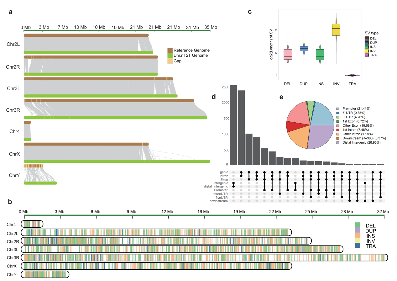 图2:Dm.nT2T与R6基因组共线性比对及结构变异染色体分布图谱。